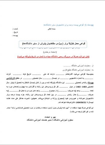 5. تکمیل و بارگذاری گواهی بیست درصد برای دانشجویان سایر دانشگاه‌ها: متن گواهی مورد نظر در سربرگ دانشگاه محل تحصیل کارشناسی کپی شده و پس از درج شماره، تاریخ و امضاء در صفحه ثبت نام بارگذاری شود. ارائه این گواهی صرفا برای متقاضیان سایر دانشگاه ها (غیر از دانشگاه خلیج فارس) الزامی است. متن گواهی را در پیوست 1 این فراخوان ببینید.