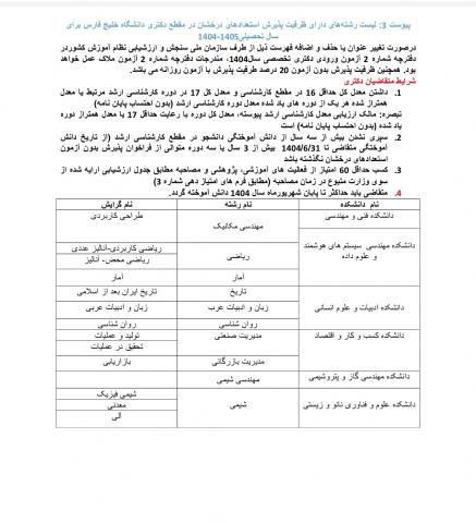 بدین وسیله به اطلاع دانشجویان و متقاضیان گرامی می رساند دانشگاه خلیج فارس در نظر دارد برای مقاطع تحصیلی کارشناسی ارشد و دکتری از بین دانشجویان استعداد درخشان و حائز شرایط مطابق با آیین نامه های پذیرش بدون آزمون (بارگذاری شده در سایت دانشگاه ) برای سال تحصیلی 1405-1404 اقدام به پذیرش دانشجو بدون شرکت در آزمون نماید. متقاضیان می توانند از تاریخ 10/10/1403 لغایت 30/10/1403 جهت دریافت فراخوان پذیرش، رشته های مورد تقاضا به سایت دانشگاه خلیج فارس به آدرس  www.pgu.ac.ir مراجعه و جهت ثبت نام، مدارک مورد نیاز را به آدرس ایمیل talented.stud [at] pgu.ac.ir ارسال نمایند.
