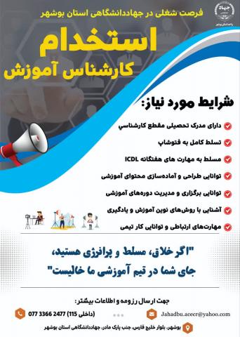 جهاد دانشگاهی استان بوشهر به منظور تکمیل نیروی انسانی و بهبود کیفیت ارائه خدمات آموزشی خود در نظر دارد از بین فارغ التحصیلان با استعداد و توانمند در رشته‌های مدیریت در تمامی گرایش ها و همچنین فارغ التحصیلان رشته‌های مرتبط با گرافیک و کامپیوتر، دعوت به همکاری نماید.