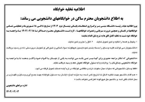 قابل توجه دانشجویان گرامی ساکن در سراهای دانشجویی، مطابق با تصمیم هیئت رئیسه دانشگاه و اعلام وزارت علوم، تحقیقات و فناوری در خصوص برگزاری امتحانات نیمسال دوم تحصیلی ۱۴۰۳، تعطیل شدن خوابگاهها و لزوم انجام سمپاشی لازم است دانشجویان محترم حد اکثر تا ۱۸ تیرماه نسبت به تخلیه خوابگاه اقدام کنند.