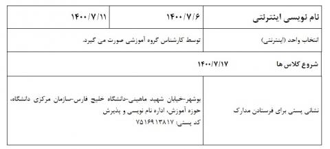 ::فرآیند پذیرش و نام نویسی شما در این دانشگاه در دو مرحله (1) نام نویسی اینترنتی و (2) ارسال مدارک (از طریق پست) می باشد و انجام هر دو مرحله، بایسته است.