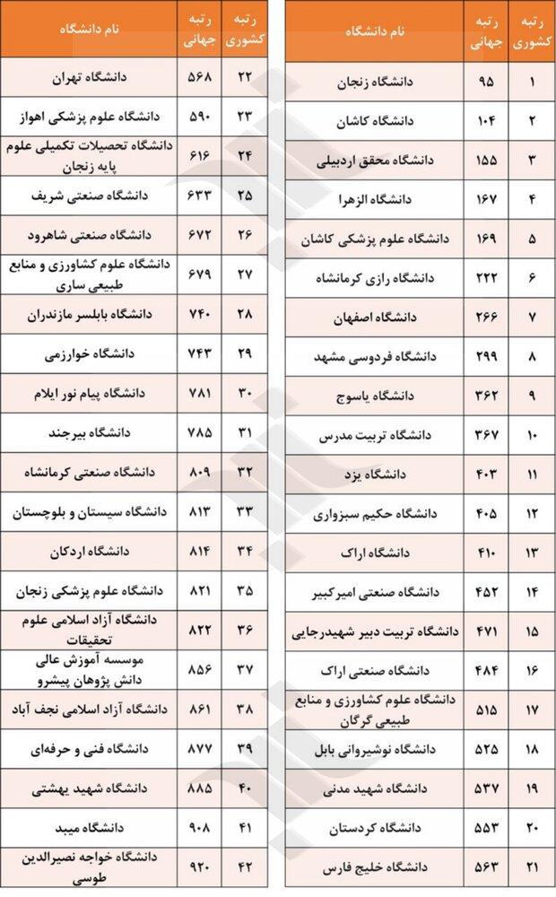 از ۹۵۶ دانشگاهی برتر این لیست، ۴۲ دانشگاه از کشور ایران هستند که اسامی، رتبه کشوری و جهانی آن‌ها در جدول زیر آمده است: