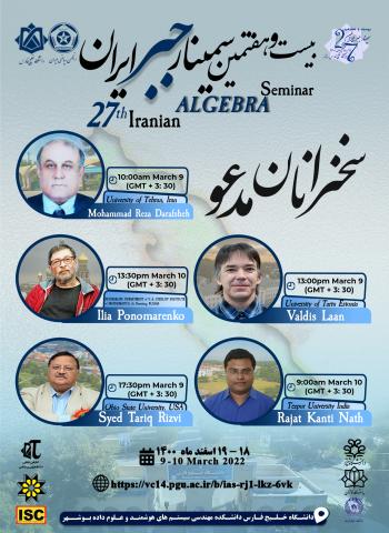 بیست و هفتمین سمینار جبر ایران، در روزهای چهارشنبه و پنج شنبه ۱۹- ۱۸ اسفند ۱۴۰۰ به میزبانی دانشگاه خلیج فارس، به صورت مجازی برگزار خواهد شد.