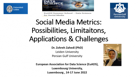 دکتر زهره زاهدی عضوهییت علمی گروه علم اطلاعات دانشگاه خلیج فارس و پژوهشگر دانشگاه لایدن هلند به دعوت انجمن اروپایی علم داده European Association of Data Science (EuADS) و دانشگاه لوگزامبورگ در مدرسه تابستانی علم داده برای رسانه های اجتماعی EuADS Summer School Data Science for Social Media که در تاریخ 24 الی 27 خردادماه 1401 در کشور لوگزامبورگ برگزار شد به تدریس پرداخت. مخاطبان مدرسه تابستانی علم داده اساتید، دانشجویان دکتری، و پژوهشگران فوق دکتری حوزه علم داده، هوش مصنوعی و یادگیری ماشین بودند. عنوان درس کاربردها و چالش های شاخص های رسانه های اجتماعی و محورهای تدریس شامل تعریف و تفسیر، چالش ها، محدودیتها، امکانات و کاربرد و تجزیه و تحلیل داده های رسانه های اجتماعی بود. درس مذکور با استقبال خوب مخاطبین این مدرسه تابستانی روبرو شد و سوالات و بحث های مختلفی پیرامون موضوع درس را بهمراه داشت. در پایان از مشارکت ارزشمند ایشان به مدرسه تابستانی امسال قدردانی بعمل آمد. انجمن اروپایی علم داده یک شبکه اروپایی متشکل از متخصصان داده است که با هدف ایجاد محیطی برای تقویت ارتباطات و همکاری بین همه ذینفعان علم داده شکل گرفته است. این انجمن با توسعه مدلها، روشها و ابزارهای علم داده، محیطی منحصربفرد برای ارائه و بحث درباره روشها و مدلهای جدید فراهم میکند و ذینفعان و تصمیم گیرندگان را در این زمینه گرد هم میآورد تا به چالشهای علم داده در جهان بپردازند. اطلاعات بیشتر در خصوص این مدرسه تابستانی از طریق لینک زیر قابل دسترسی می باشد: