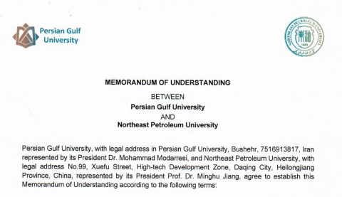 دانشگاه خلیج فارس و دانشگاه نفت شمال شرق چین در راستای توسعه تعاملات علمی مشترک در تاریخ 25 تیر 1401 به امضای تفاهم نامه همکاری در سطح روسای دو دانشگاه مبادرت ورزیدند. به گفته دکتر آرش خسروی اهداف تفاهم نامه مذکور که به امضای روسای دو دانشگاه، دکتر محمد مدرسی و دکتر جیانگ، رسیده است و به مدت 5 سال معتبر می باشد عبارتند از: