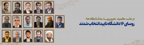 دبیر شورای عالی انقلاب فرهنگی، ضمن آرزوی موفقیت برای افراد انتخاب شده بیان کرد: بر این اساس دکتر محمد مدرسی به عنوان رئیس دانشگاه خلیج فارس، دکتر مجتبی ذوالفقاری به عنوان رئیس دانشگاه اراک، ، دکتر سهیل واشقانی فراهانی به عنوان رئیس دانشگاه تفرش، دکتر عباس کتابی به عنوان رئیس دانشگاه کاشان، دکتر محمد شیخزاده به عنوان رئیس دانشگاه بجنورد، دکتر مجتبی مختاریان اصل به عنوان رئیس دانشگاه صنعتی ارومیه، دکتر ابراهیم محمدی منش به عنوان رئیس دانشگاه ملایر، دکتر احمد لامعی گیو به عنوان رئیس دانشگاه بیرجند، دکتر محمد عباسزاده جهرمی به عنوان رئیس دانشگاه جهرم، دکتر سید سعیدرضا اسلامی به عنوان رئیس دانشگاه دامغان، دکتر عزیز الله گنجی، به عنوان رئیس دانشگاه صنعتی نوشیروانی بابل، دکتر احمدرضا ربانی به عنوان رئیس دانشگاه علم و فناوری مازندران، دکتر عباسعلی رضاپور به عنوان رئیس دانشگاه صنعتی بیرجند، دکتر ستار خالدیان به عنوان رئیس دانشگاه هنر شیراز، دکتر محمد حسین رحمانی دوست به عنوان رئیس دانشگاه نیشابور و دکتر رضا مراد صحرایی به عنوان رئیس دانشگاه فرهنگیان انتخاب شدند.