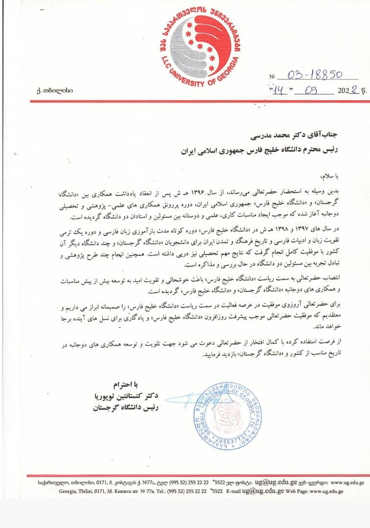 بدین وسیله به استحضار حضرتعالی می رساند از سال ۱۳۹۶هجری شمسی پس از انعقاد یادداشت همکاری بین دانشگاه گرجستان و دانشگاه خلیج فارس جمهوری اسلامی ایران دوره پررونق همکاری علمی، پژوهشی و تحصیلی دو جانبه آغاز شده که موجب ایجاد مناسبات کاری، علمی و دوستانه بین مسئولین و استادان دانشگاه گردیده است.