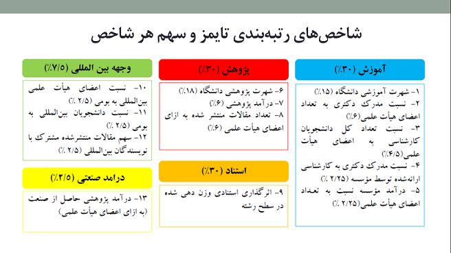 📃 رتبه‌بندی جهانی آموزش عالی «تایمز»، مؤسسه‌های پیشرو جهان را در پنج زمینه‌ی آموزش (با وزن ۳۰ درصد)، پژوهش (با وزن ۳۰ درصد)، استنادها (با وزن ۳۰ درصد)، درآمدهای صنعتی (با وزن ۵/۲ درصد) و چشم‌انداز جهانی (با وزن ۵/۷ درصد)؛ بر پایه‌ی ۱۳ سنجه‌ی کمی ارزیابی می‌کند.