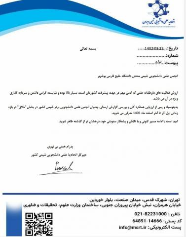 انجمن علمی دانشجویی شیمی محض دانشگاه خلیج فارس در بخش خلاق بعنوان انجمن برتر کشور شناخته شد