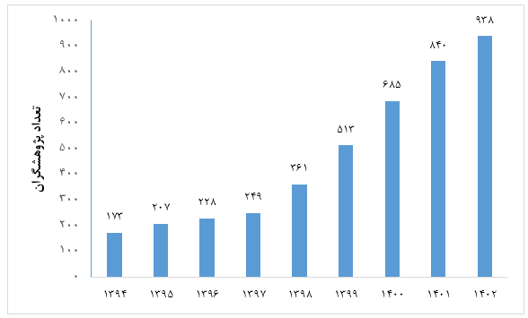 موسسه ISC، آخرین فهرست پژوهشگران ایرانی پر استناد یک درصد برتر جهان در 22 حوزه موضوعی علوم را بر اساس پایگاه شاخصهای اساسی علم (ESI) فهرست پژوهشگران پر استناد یک درصد جهان در سال 2023 را استخراج و پایش نموده است. همان طور که در نمودار 1 قابل مشاهده است، در سال 1402، 938 پژوهشگر با وابستگی سازمانی جمهوری اسلامی ایران شناسایی شده اند که نسبت به سال 1401، 12 درصد رشد داشته است. خوشبختانه در طی یک دهه گذشته آمار پژوهشگران پر استناد یک درصد برتر کشور روند رو به رشدی داشته است.