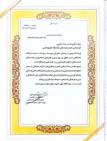 از کارشناس فرهنگی دانشگاه خلیج فارس به عنوان رابط، کارشناس برتر فرهنگی و کارشناس پاسخگو تقدیر شد