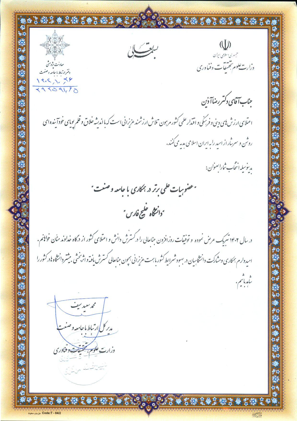 صدرنشینی پروفسور رضا آذین استاد تمام دانشگاه خلیج فارس در رده بندی وزارتی