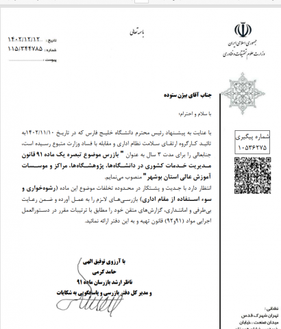 بازرس موضوع تبصره یک ماده ۹۱ قانون مدیریت خدمات کشوری در دانشگاهها، پژوهشگاهها، مراکز و موسسات آموزش عالی استان بوشهر منصوب شد