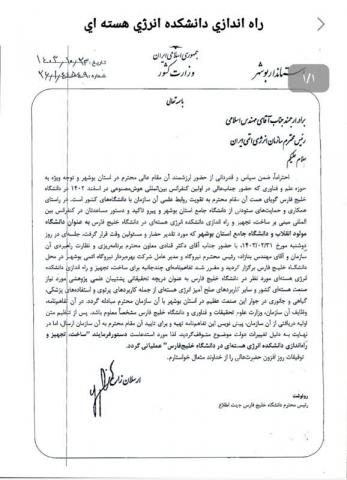 محمد مدرسی، رئیس دانشگاه خلیج فارس، با استقبال از این پیشنهاد، اظهار داشت: "راه‌اندازی دانشکده انرژی هسته‌ای، علاوه بر ارتقای سطح علمی استان، فرصت‌های شغلی بسیاری را در حوزه انرژی هسته‌ای ایجاد خواهد کرد و به توسعه صنعتی استان کمک شایانی خواهد نمود.