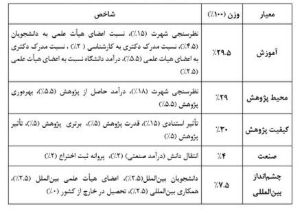 جدول. شاخص‌های رتبه‌بندی دانشگاه‌های جهان تایمز