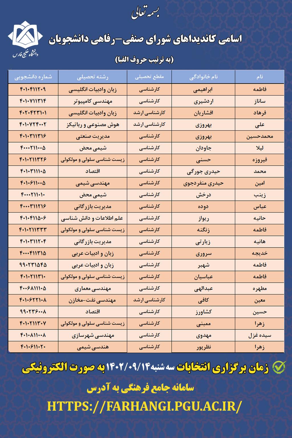 این انتخابات در روز سه شنبه مورخ 1402/09/14 بصورت الکترونیکی در سامانه جامع فرهنگی دانشگاه به آدرس http://farhangi.pgu.ac.ir برگزار می گردد.