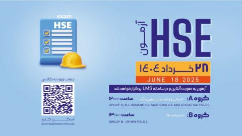 به اطلاع دانشجویان محترم تحصیلات تکمیلی می‌رساند، آزمون HSE نوبت خرداد ماه 1404 در روز چهارشنـــبه مورخ 28 خرداد ماه طبق برنامه ذیل به صورت آنلاین در سامانه LMS برگزار خواهد شد.